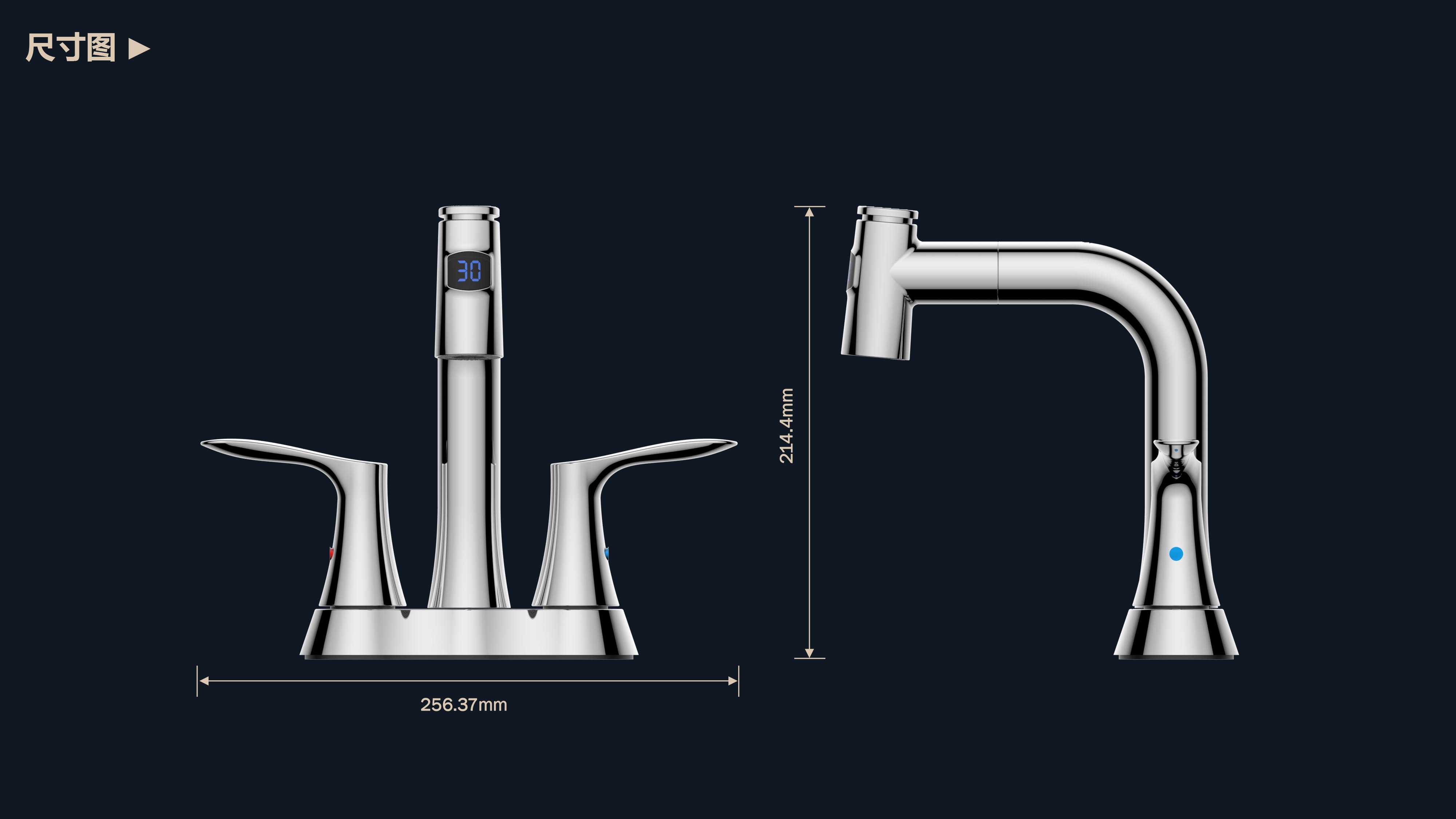 即時顯示溫度,安全防燙;日常洗頭利器,抽拉出水輕松洗;按壓切換兩功能水花;適合4寸3孔安裝臺面