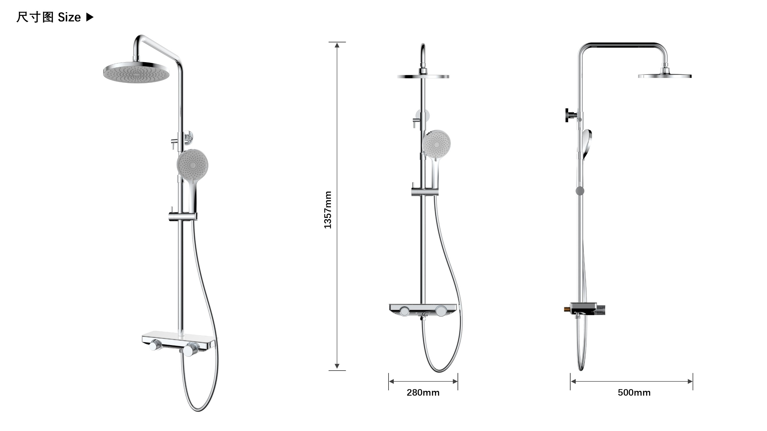 至美星空花灑;寬大置物面板放置洗護用品;旋轉切換頂噴/花灑/下出水