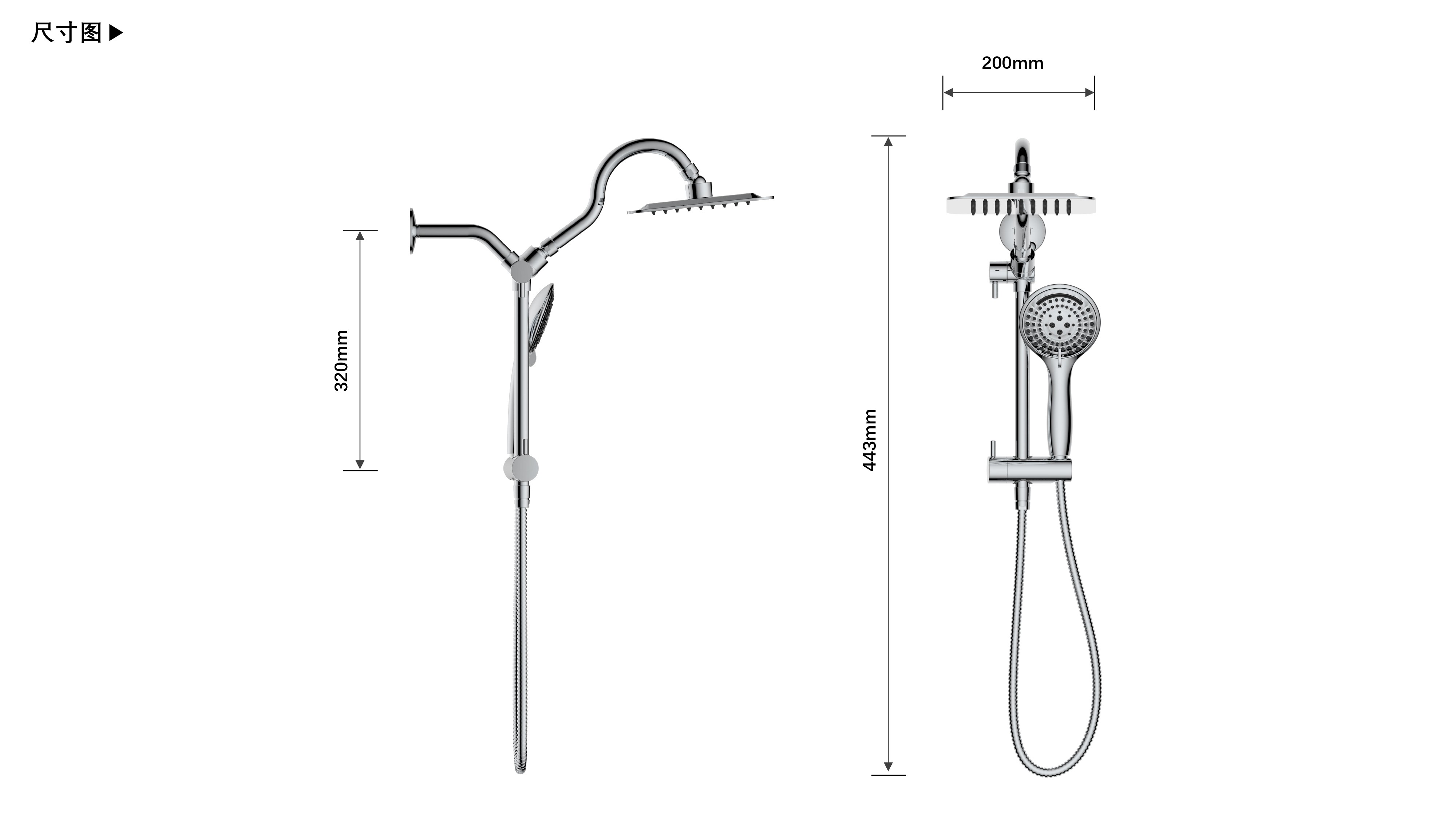 上出水彎管套裝;頂噴內(nèi)置球頭,可實(shí)現(xiàn)多角度旋轉(zhuǎn)調(diào)整;把手切換頂噴出水、花灑出水;轉(zhuǎn)動(dòng)把手調(diào)節(jié)滑座高低