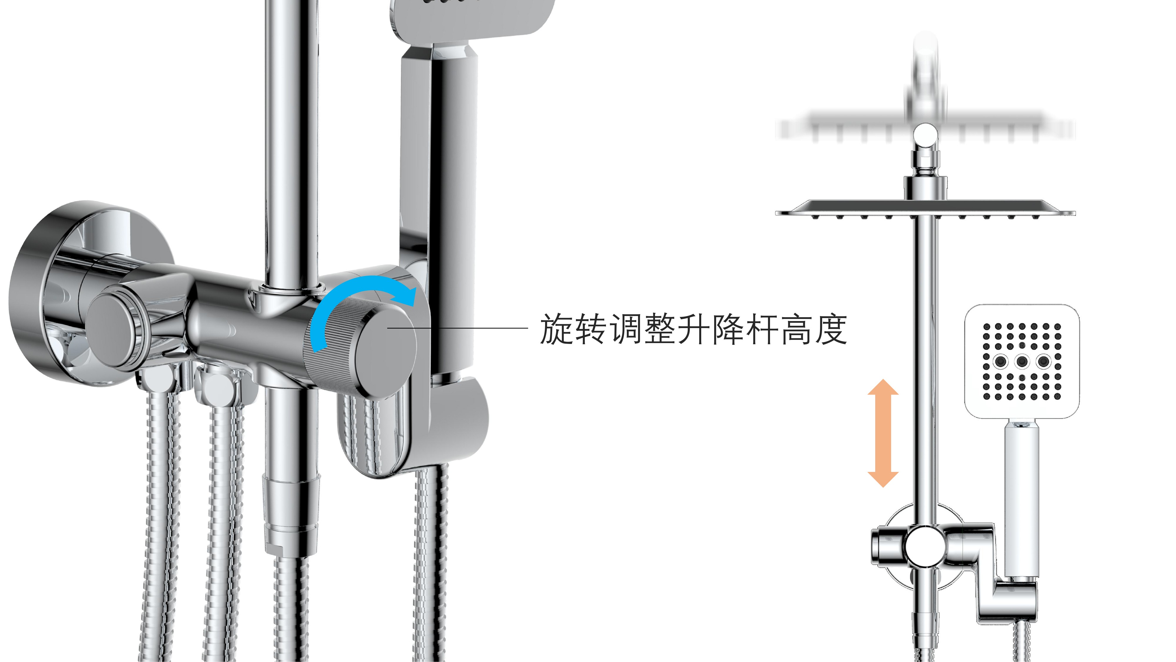 方形寬大頂噴;Z字形三通;按壓切換頂噴/花灑出水
